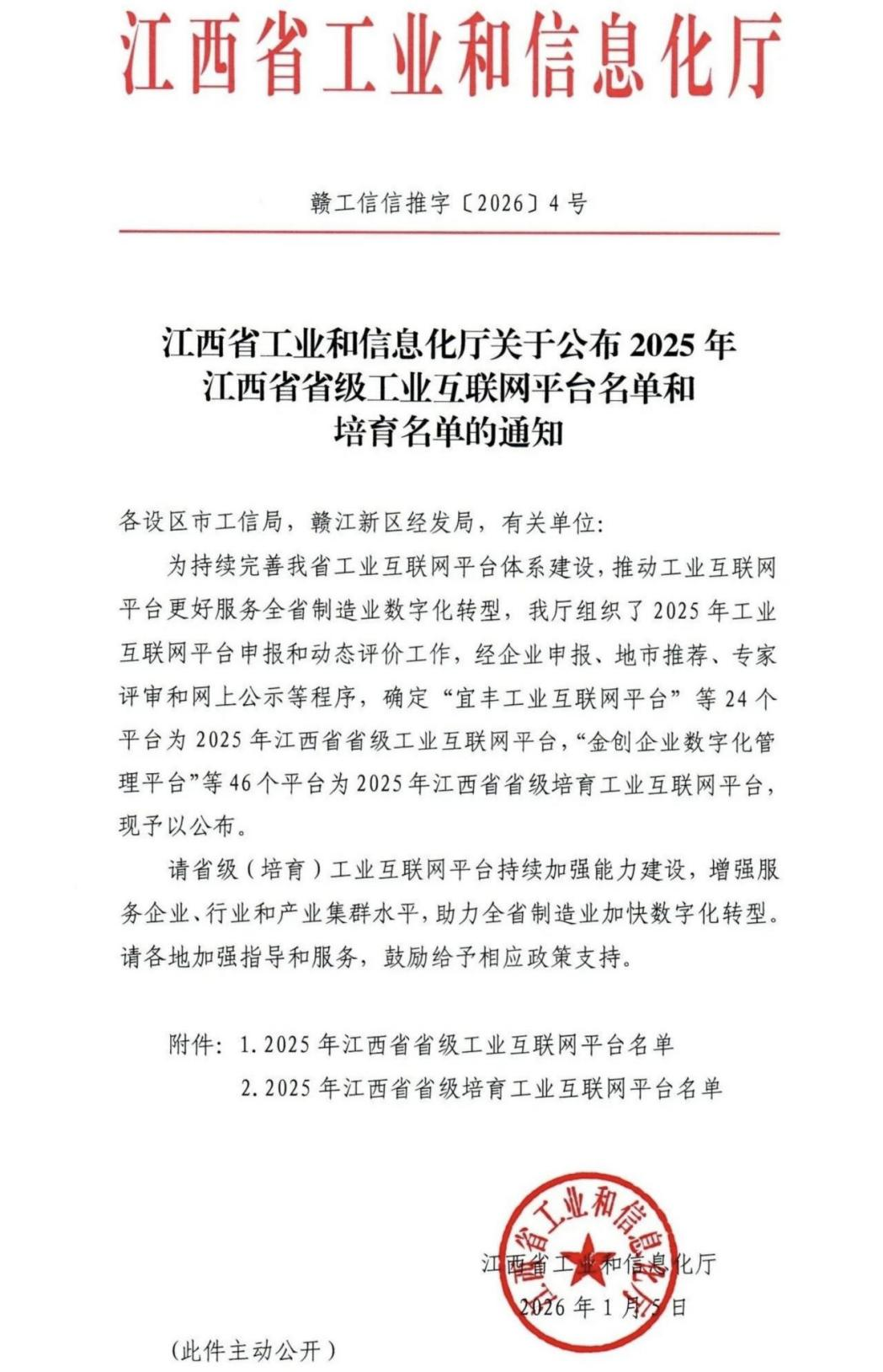 此次评选由江西省工业和信息化厅组织开展,旨在持续完善我省工业互联网平台体系建设,推动工业互联网平台更好服务全省制造业数字化转型。评选结果显示,24个平台获评2025年江西省省级工业互联网平台,46个平台入选省级培育工业互联网平台。入选的省级(培育)工业互联网平台将持续加强能力建设,提升服务企业、行业及产业集群的水平,助力全省制造业加快数字化转型。