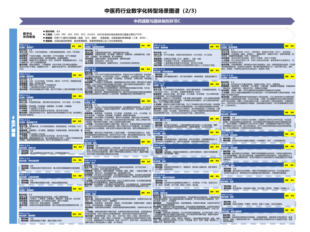 该图谱以系统工程方法论为指导,围绕中药产业核心环节与业务,系统构建了“1-5-4-94”框架体系:即以产品开发、原料采购、生产制造、销售服务4个关键产业链环节构成的完整链条为1条主线,紧扣研发、生产、运维、经营、供应链5大业务活动,依托数据、技术、人才、方法4大核心要素支撑,共梳理出94个典型数字化场景。图谱横向贯通产业链协同,纵向集成各环节业务,全面呈现中药产业链数字化转型的全景路径与关键节点。配套编制的《场景汇编》进一步明确了各场景的要素清单,为实践落地提供了具体工具。