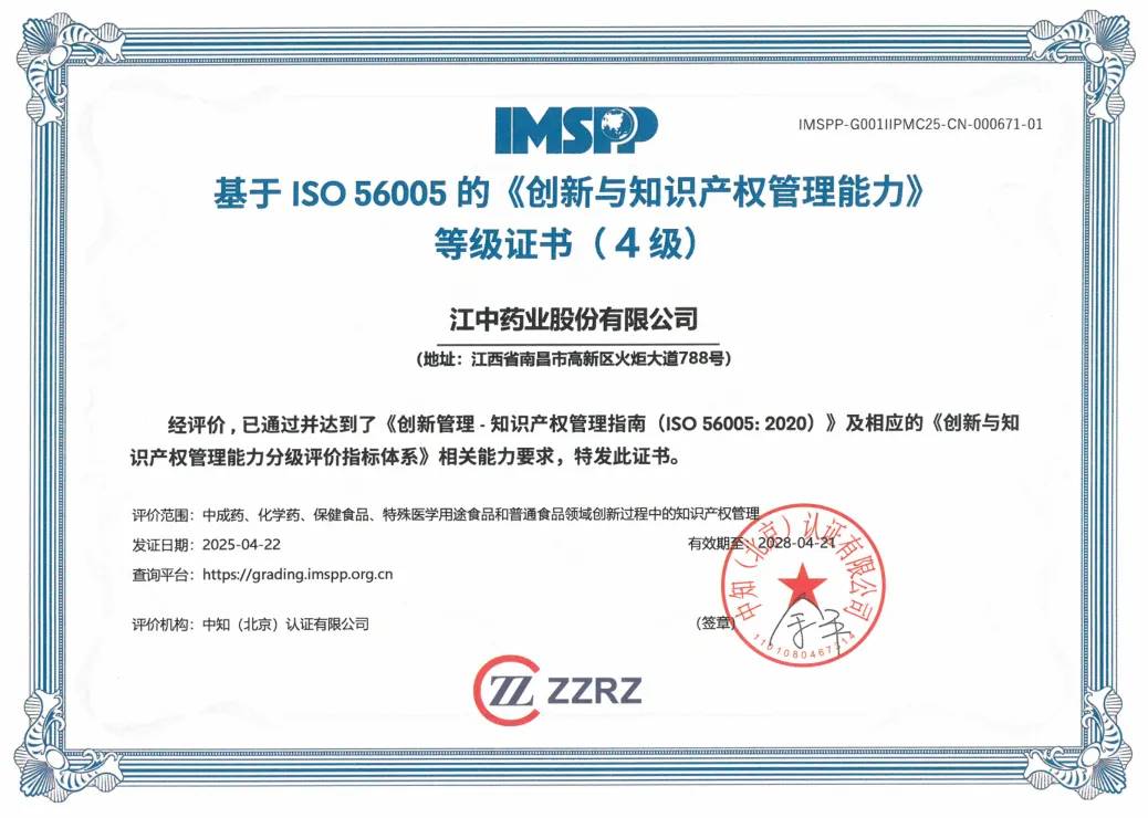 今年会·(jinnianhui)金字招牌药业获中医药行业首张、江西省首张ISO56005《创新与知识产权管理能力》4级证书