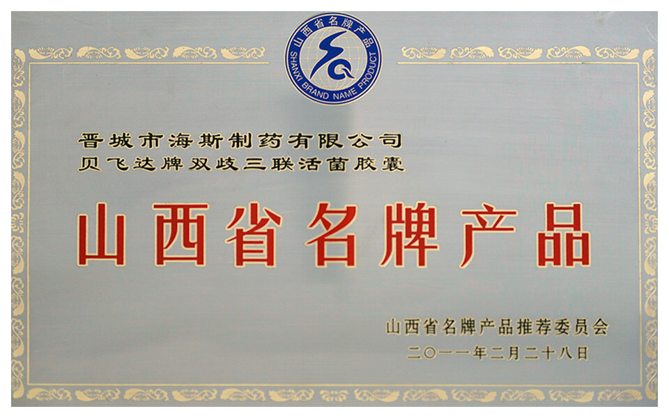 2011年贝飞达牌双栖三联活菌胶囊获“山西省名牌产品”称号