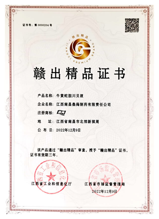2022年牛黄蛇胆川贝液获江西省“赣出精品”称号