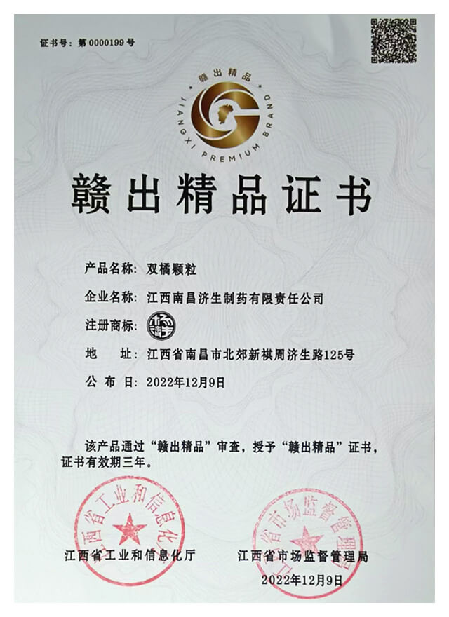 2022年双橘颗粒获江西省“赣出精品”称号